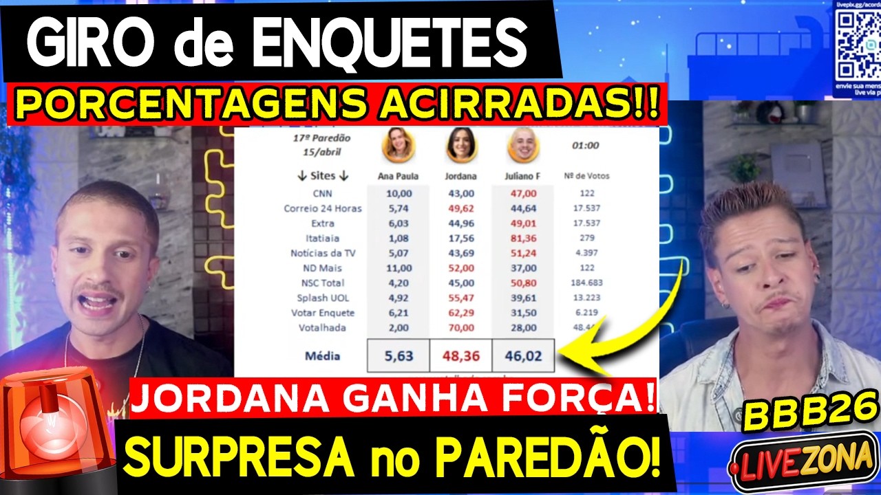 🚨BBB26: QUEM SERÁ ELIMINADO? ANA PAULA, JORDANA ou JULIANO? Saiba quem vai sair no Giro de Enquetes! Fique por dentro dos últimos babados do BBB26 e das notícias mais comentadas na internet, de forma divertida e interativa AO VIVO com Kah e Gabs na LiveZona!