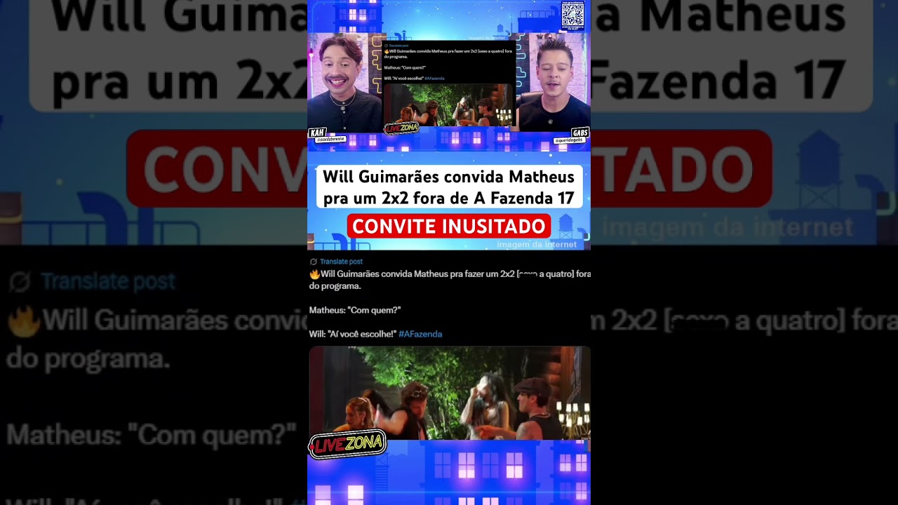 Categories Entretenimento Will Guimarães convida Matheus para um 2×2 fora de A Fazenda 17. By acordaberenice Estimated read time 0 min read outubro 18, 2025 0